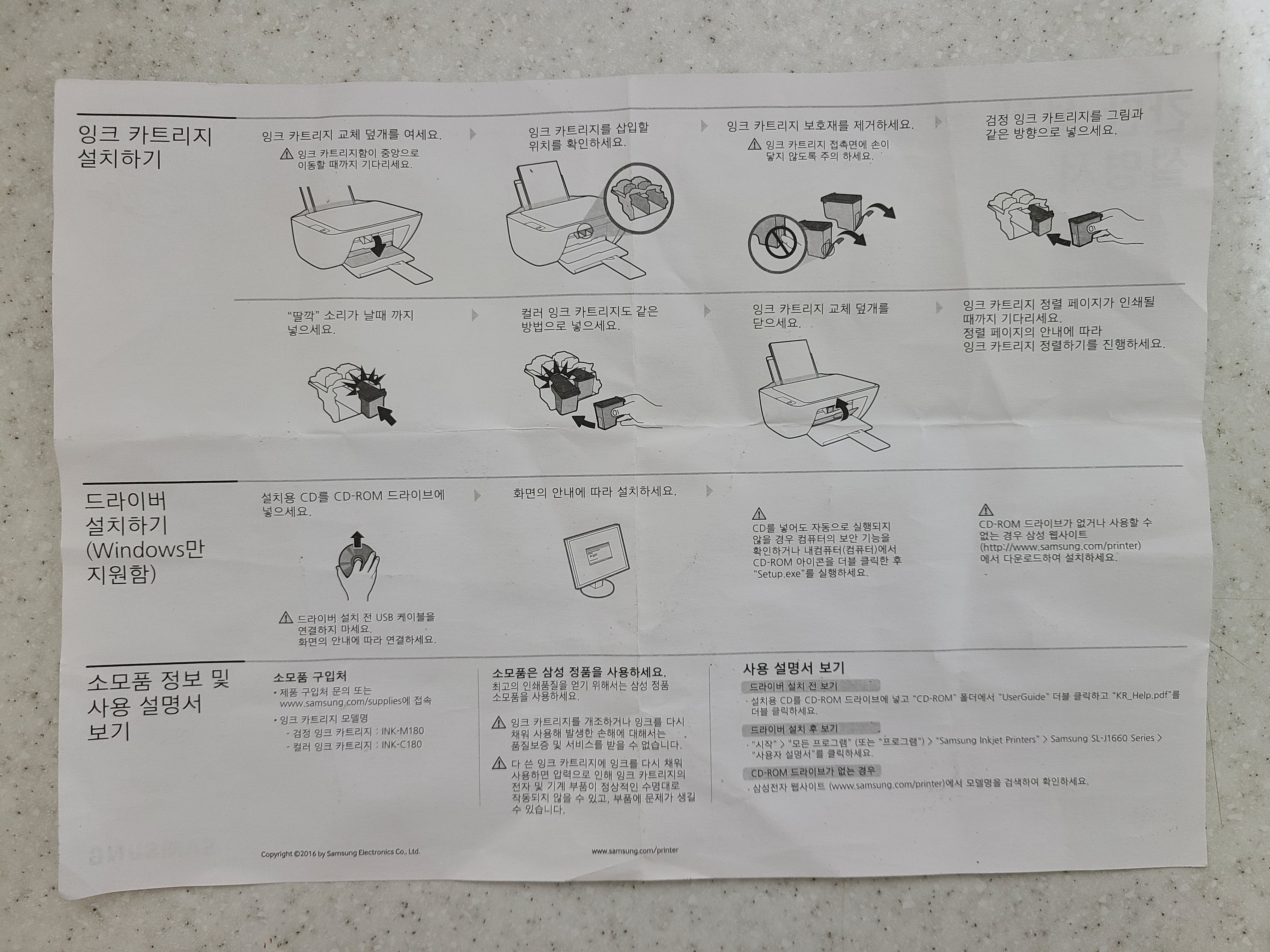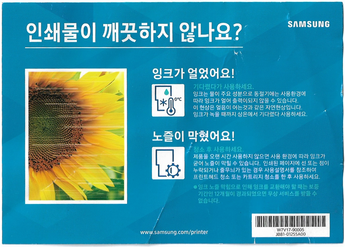원래 프린터 사면, 프린터 박스 안에 있는 종이들인데 옛날처럼 두툼한 설명서나 드라이버 CD 등은 더이상 제공하지 않는 걸로 보여집니다. 그래도 혹시나해서 스캔해봅니다.