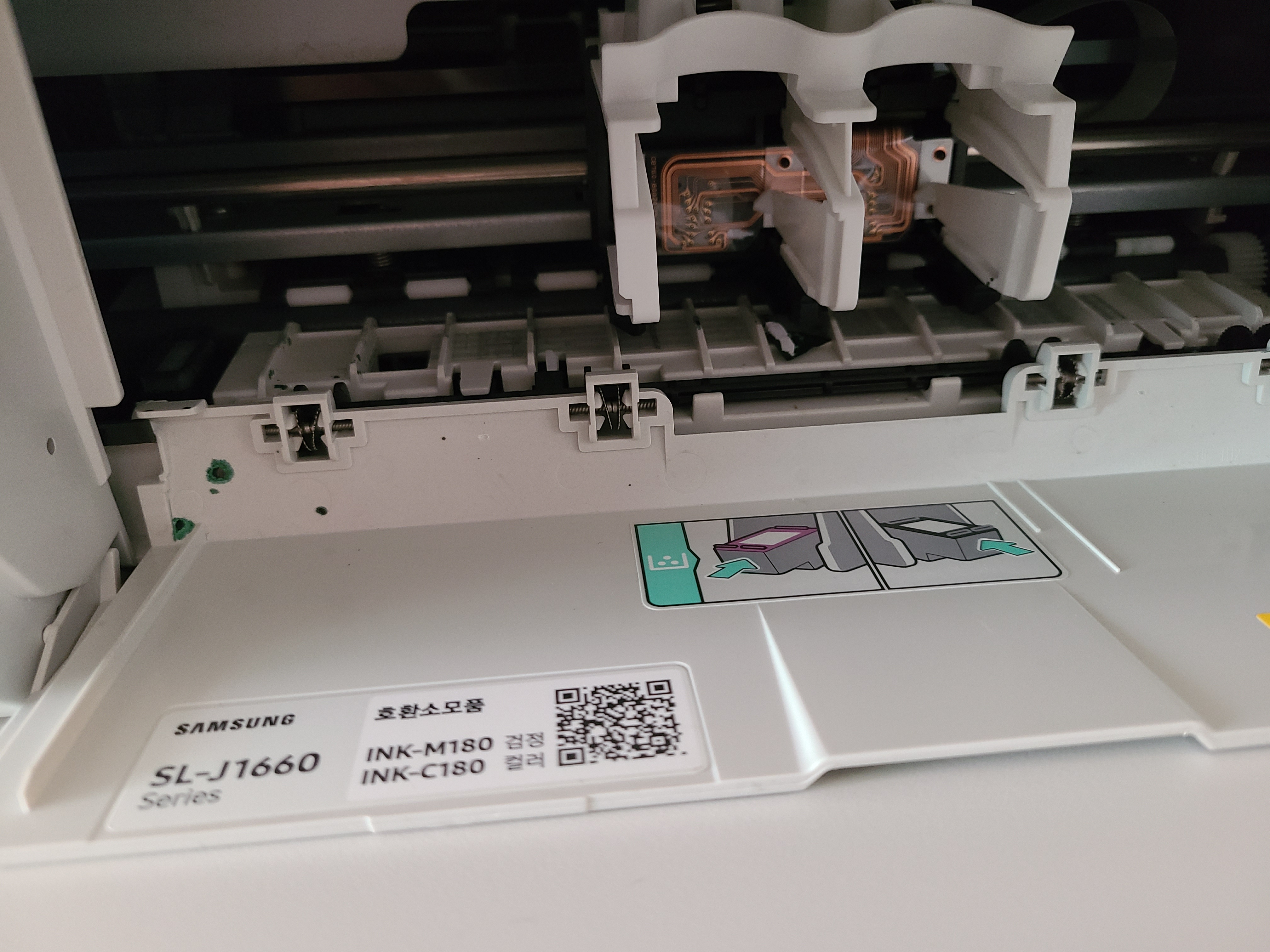 프린터 하단 덮개를 여시면 알아서 잉크 삽입구가 가운데로 나타납니다.