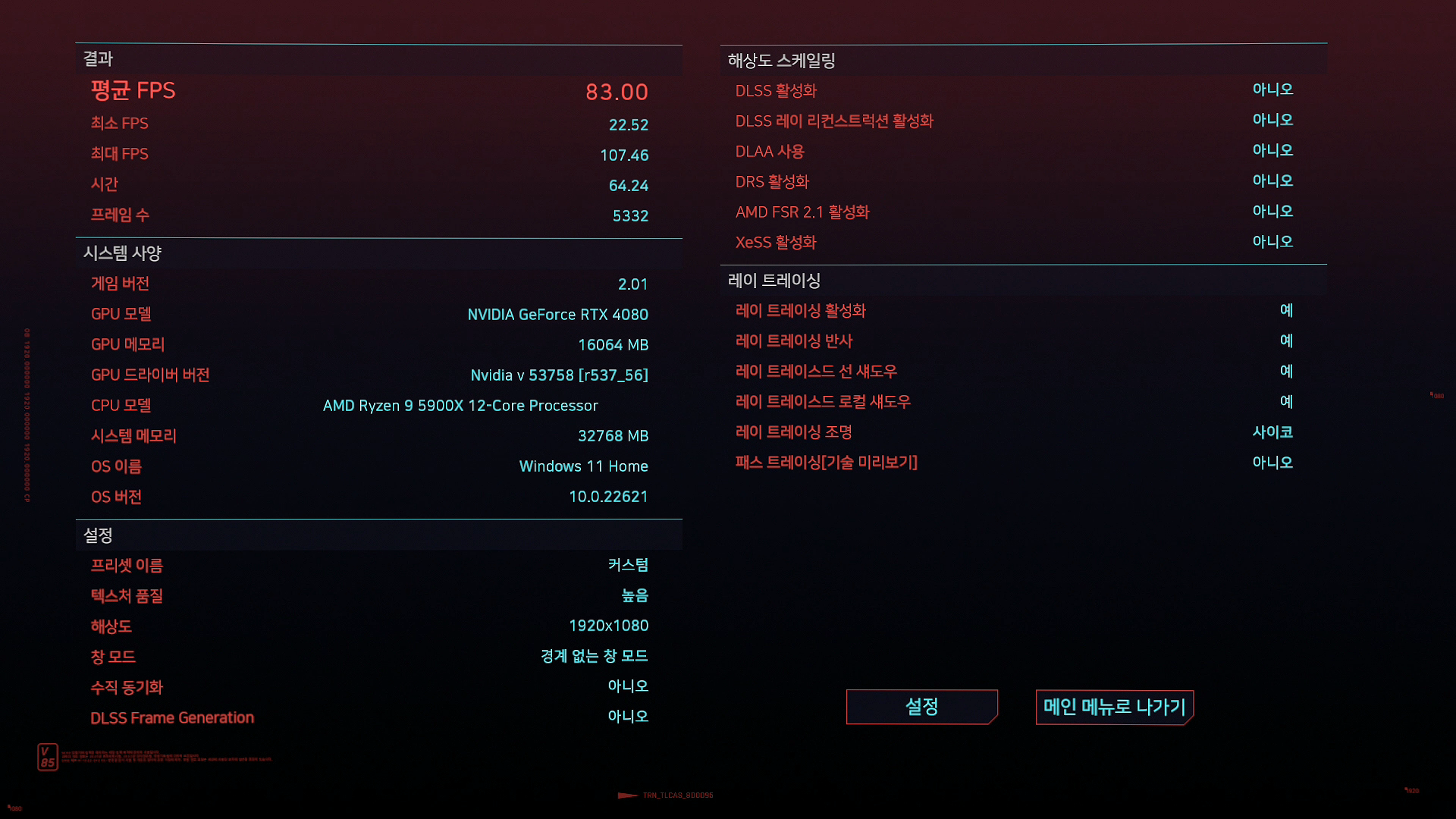 Full HD 해상도, 모든 옵션 최상급 (울트라, 사이코 등)에 패스 트레이싱 같은 이상한 메뉴는 끈 상태로 진행했습니다. 좀 더 자세한 세팅값 궁금하신 분들은 영상을 봐주시면 되겠습니다. DLSS, FSR, XeSS, 로우 레이턴시 등등 프레임 향상에 도움이 되는 기능들이 켜져있으면 성능 측정에 방해되니 실제 성능 확인을 위해 이런 기능들은 전부 끈 상태로 진행했습니다.