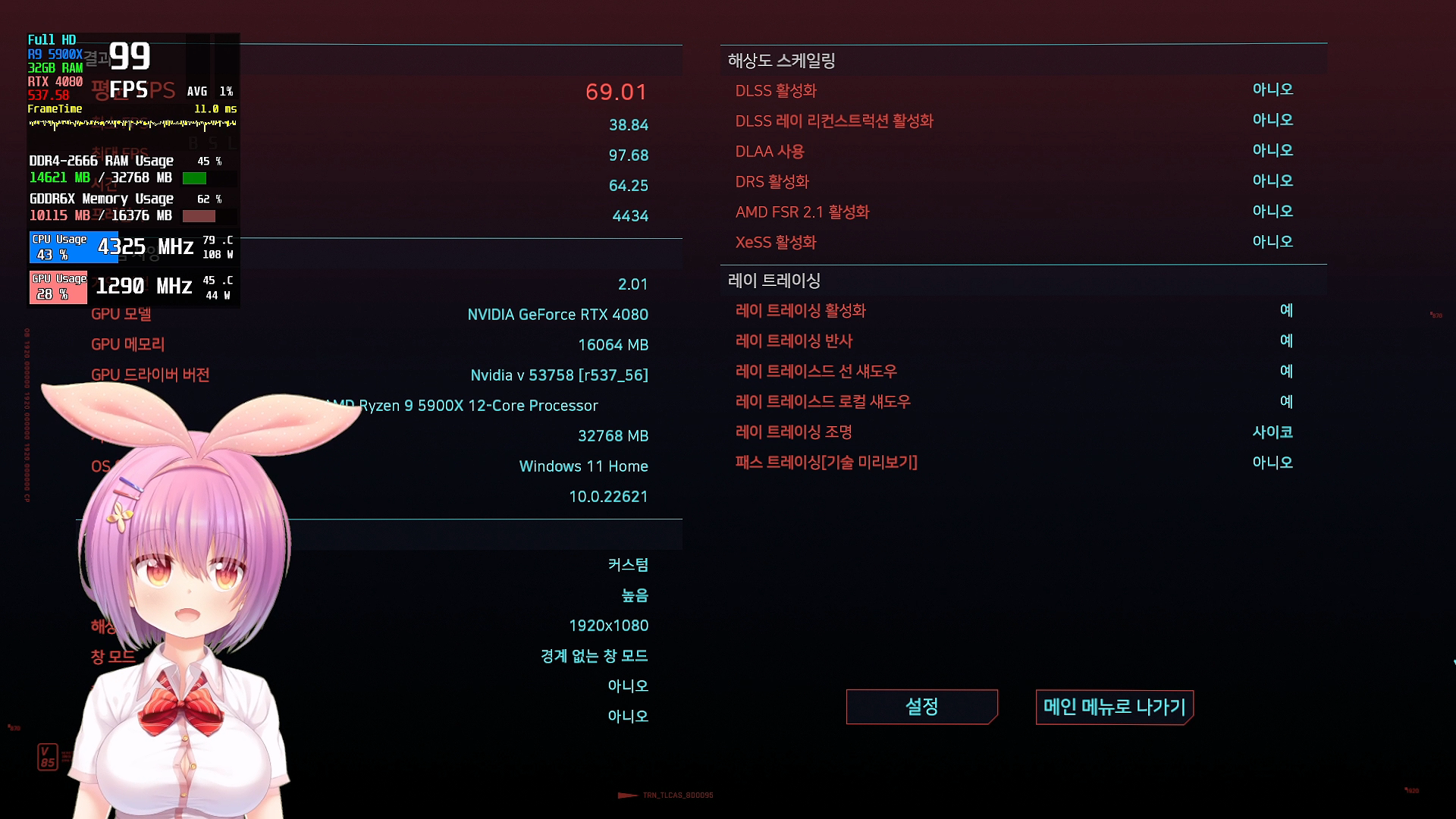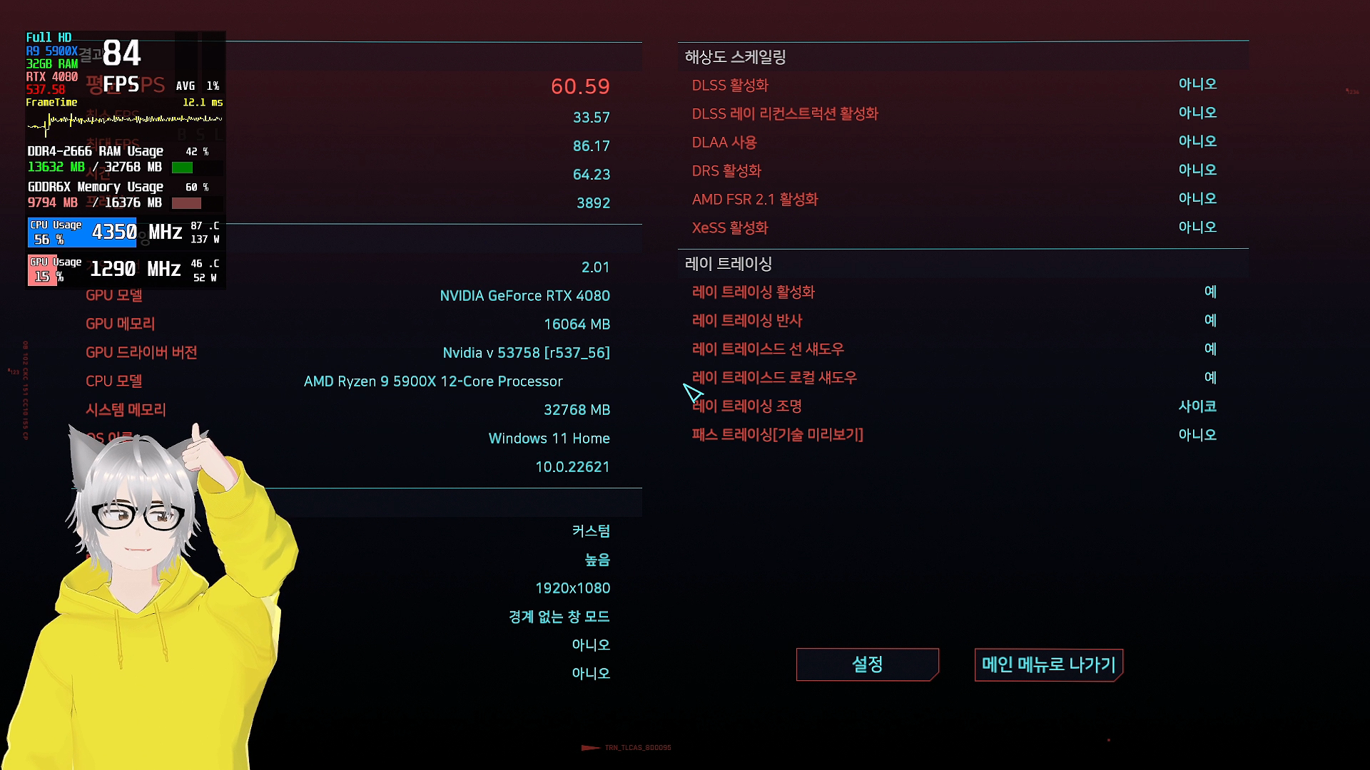 버튜버 앱 실행시 사펑2077 벤치마킹 모드 결과