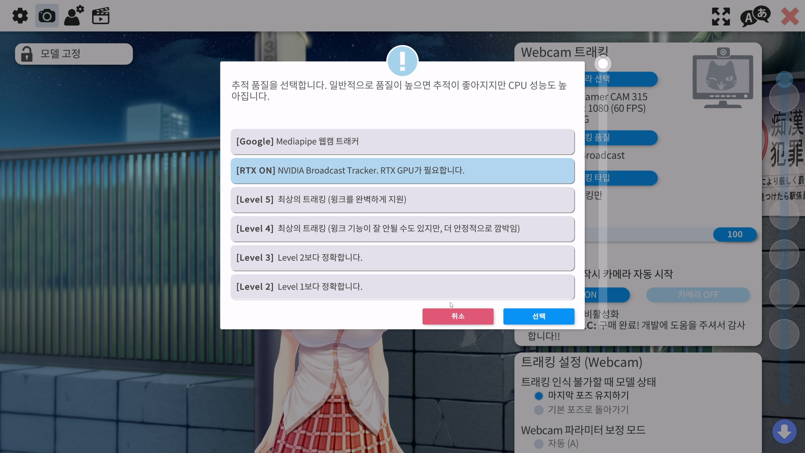 VTube Studio는 Live2D 형태의 캐릭터를 사용하여 버튜버 방송을 할 수 있게 해주는 프로그램인데, 어지간한 버튜버 분들은 많이 사용할 정도로 유명한 프로그램입니다. 트래킹 품질 옵션 중에 [ 레벨 5 ] 와 [ RTX ON ] 두 종류가 있는데, 여기서는 RTX ON을 선택했습니다.