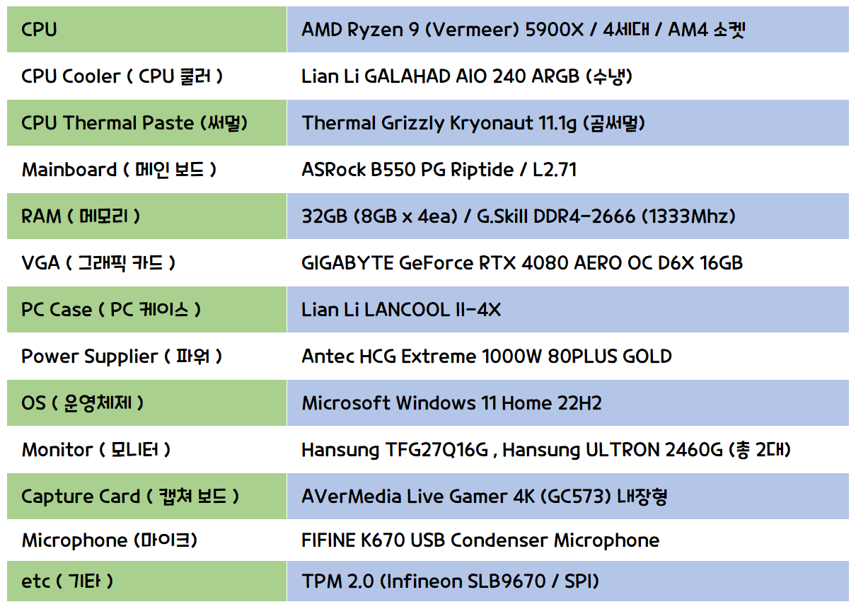 우선, OBS Studio를 비롯해서 불필요한 프로그램들 실행하지 않은 상태 그대로 벤치마킹을 돌린 결과값이 되겠습니다. 별도의 컴퓨터로 연결해서 녹화했습니다. 투컴 방송, 즉, 캡쳐보드를 이용해서 컴퓨터 2대를 연결한 후, 한쪽 컴퓨터로 게임하면, 다른 컴퓨터로 녹화하는 그런 방식으로 녹화했습니다. 그래서 PC 성능에는 아무런 영향을 주지 않습니다. 저 결과값 믿으셔도 좋습니다.