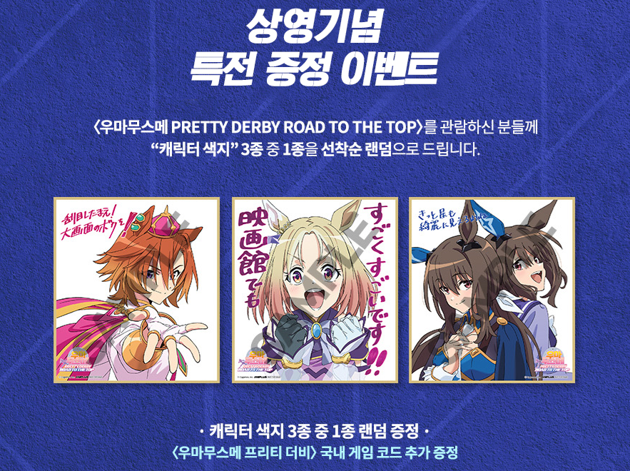 일본 현지에서도 캐릭터 색지 같은거 제공했다고 하는데, 우리나라도 똑같이 제공하는 군요. 게다가 국내 게임 코드도 제공한다고 합니다. 카카오게임즈에서 서비스중인 "우마무스메 프리티더비" 게임 코드가 제공되는 것으로 보여집니다.